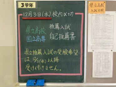 2025.12.2 学校からのお知らせ 重要 【重要】3年生 推薦入試(県立高校、国立高専)校内締め切り 県立高校、国立高専の推薦入試の校内締め切りは、明日、12月3日(水)です。受験を希望する人は、推薦受験自己推薦書を担任の先生に提出しましょう。
