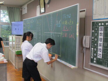 代表の生徒が、黒板でx座標とy座標を確認しながら、それをグラフに落とし込んで線で結び丁寧に描いていました。