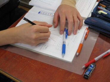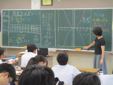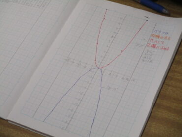 3年生の数学は今、2次関数のところを学習しています。2組では、まずはグラフを描いています。