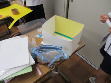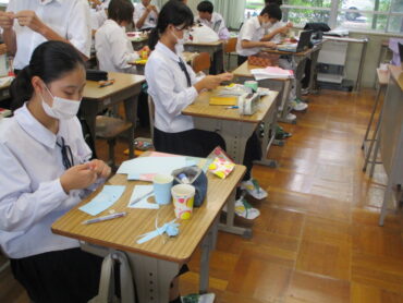 3年生の家庭科の授業です。いろいろな素材を使って幼児のおもちゃをつくっています。