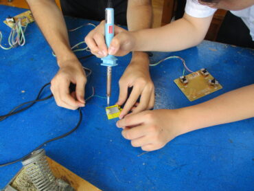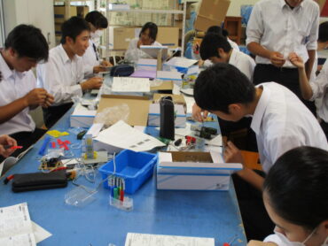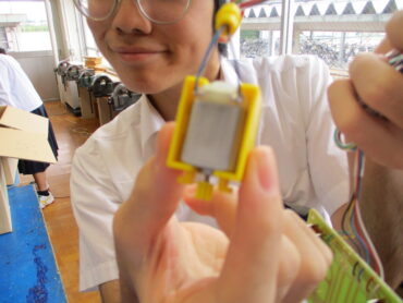モータと導線をはんだ付けしています。細かい作業なので、協力して行います。
