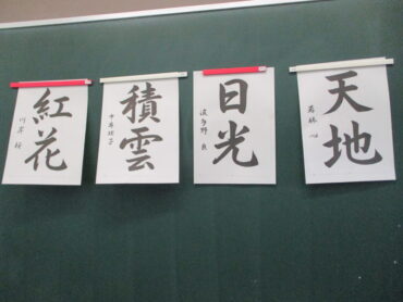 1年生の国語は今、習字の時間です。「天地」「日光」「積雲」「紅花」と書いています。