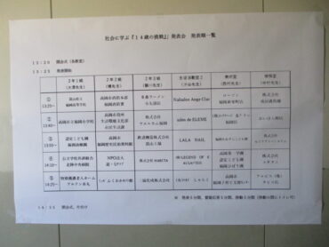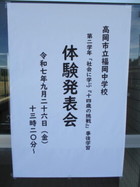 2025.9.26 1学年 2学年 2年生 今日は「14歳の挑戦」発表会です! 本日、9月26日(金)の午後、夏休み前に行った社会に学ぶ14歳の挑戦の体験をまとめた発表会を開催します。会場は、2階の2年生の教室や特別教室など6つの教室でローテーションして発表会を開催します。 お世話になった事業所の皆様にも来ていただきます。ぜひ、2年生の保護者の方々にも多数来ていただきたいと思います。