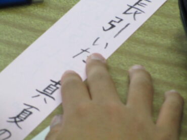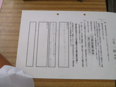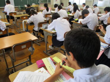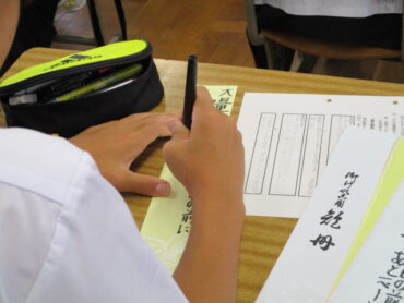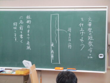 2年1組の国語の授業です。六華祭に展示する短歌をつくり短冊に書いています。