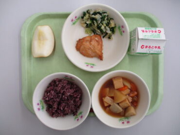 10月2日の給食は、赤米ごはん、 牛乳、 鶏肉の香り焼き、 ほうれん草のごまひたし、 かたかご煮 、りんごです。