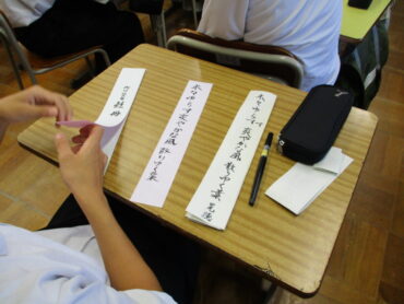 3年1組の国語の授業です。六華祭に展示する俳句をつくり短冊に書いています。