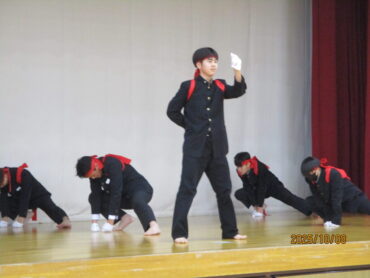 後輩の士気を高めるため、3年生の有志が応援団を組んで式を盛り上げる予定です。彼らは、約1週間早朝練習を積み重ねてきました。今日から体育館で、本番さながらの練習です。