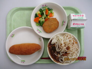 今日の給食は、1/2コッペパン、 牛乳、 なっぱコロッケ、ブロッコリーサラダ 、ソフト麺の肉みそがけです。