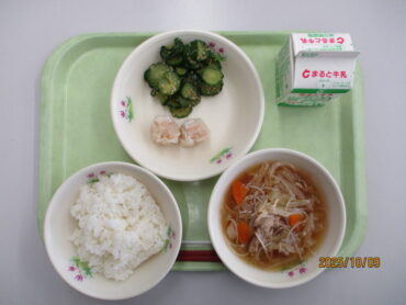 今日の給食は、ごはん 、牛乳、 えびシューマイ、胡瓜のナムル、ビーフンスープです。