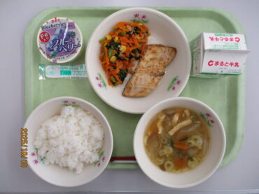 10月10日の給食は、ごはん 、牛乳、 白身魚のマヨネーズ焼き、ブルーベリーゼリー、 南瓜のみそ汁でした。