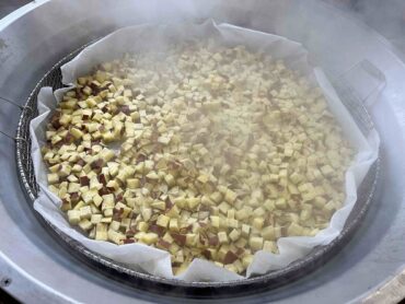2025.10.14 NEW 1学年 2学年 3学年 全校生 10月14日の給食を紹介します 今日の給食は、ごはん、 牛乳、 豚肉のジャンロー、ボイル野菜 、とうもろこしのスープです。 ボイル野菜のさつま芋は、1つ1つ芽取りをして皮むきは最小限にし、キレイな紫色の皮が残るように工夫しました。 食べやすい大きさに切ったさつま芋に塩をして、クッキングシートにのせて釜で蒸したことで、甘くほっくりした味や食感を楽しむことができます。