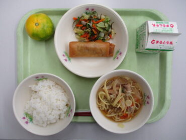 2025.10.16 1学年 2学年 3学年 全校生 10月16日の給食を紹介します 今日は減量ごはん 、牛乳、 春巻き、 即席漬け、五目ラーメン、 みかんです。 みかんは、和歌山産でした。甘くおいしかったです。