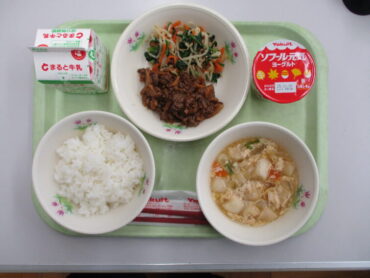 10月21日の給食は、高岡食19(たかおかしょくいく)丼献立「高岡元気ビビンバ丼」でした。メニューは、ごはん 、牛乳、 高岡元気ビビンバ丼 、ヨーグルト、 かきたま汁です。