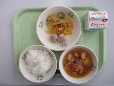 今日の給食は、ごはん 、牛乳、 肉シューマイ 、拌三絲(バンサンス)、 韓国風肉じゃがです。