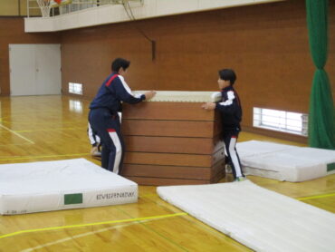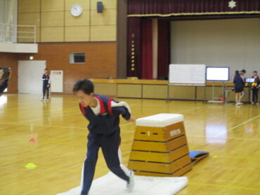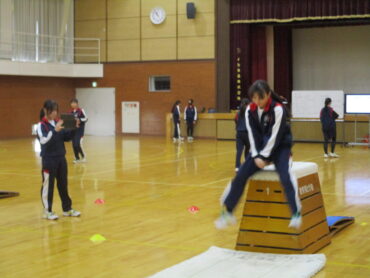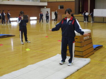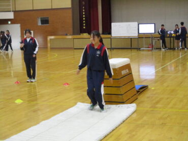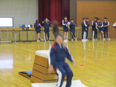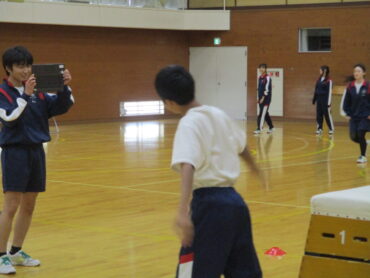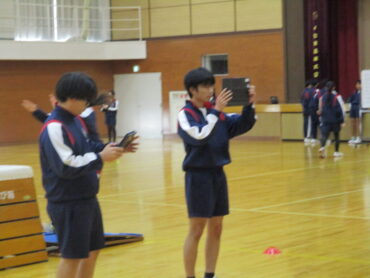 2025.10.28 NEW 3学年 学校訪問研修会② 3年保健体育 3年2組では、保健体育の授業を行いました。 単元名は「器械運動(跳び箱運動)です。 技によって跳び箱の向きを変えます。 動画を撮影してもらい修正点を確認します。 きれいに着地できるかも、大事なポイントです。