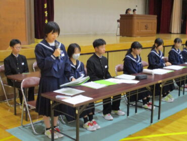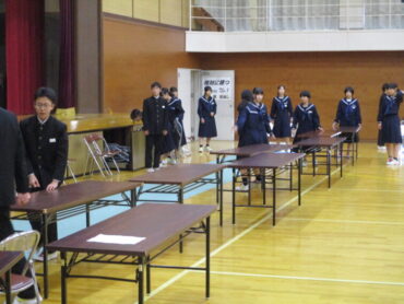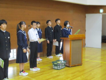 2025.10.31 1学年 2学年 3学年 全校生 生徒総会リハーサル 10月30日 10月30日の放課後、生徒総会のリハーサルを行いました。最初に、生徒会役員で会場の準備をしました。 自分の原稿を確認しています。 前期生徒会長退任の言葉です。 新役員は、一つ一つの動きを確認していました。