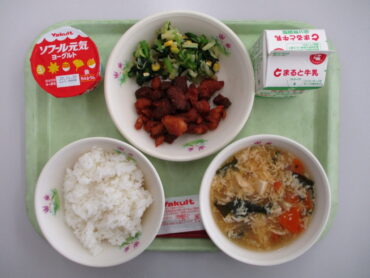 2025.11.6 1学年 2学年 3学年 全校生 11月6日の給食を紹介します 今日の給食は、牛乳、ごはん、豚肉と大豆のケチャップがらめ、青菜のコーン和え、かきたまスープ、ヨーグルトです。 高岡市産の小松菜 コーン和えの小松菜は、高岡市産です。たっぷり使用しています。 デザートは、鉄分・カルシウム強化の元気ヨーグルトです。