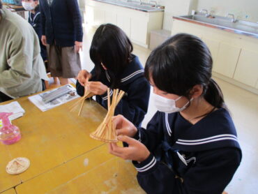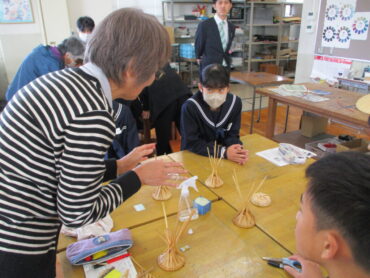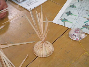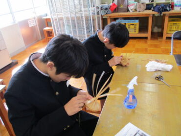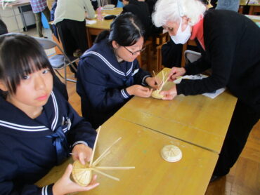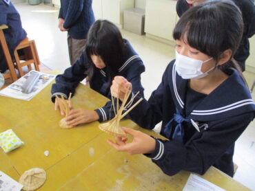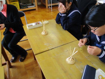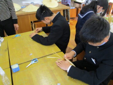 短時間であっても「菅笠づくり」の肝要がわかるよう、土台づくりはすべて講師の先生方がしてくださいました。生徒たちは、「縫い」の作業と最後の仕上げの部分を行いました。