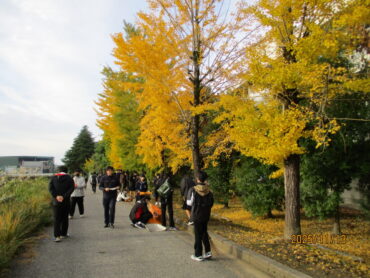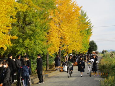 本校の教室棟と黒石川の間には、美しい銀杏ロードがあります。