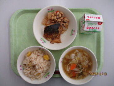 2025.11.13 1学年 2学年 3学年 全校生 11月13日の給食を紹介します 郷土食献立 今日の給食は、郷土食献立です。メニューは、牛乳、栗ごはん、鯖の香味焼き、五目豆、えのきと白菜のみそ汁です。 五目豆の「五目」とは、5種類の材料を使うということではなく「多くの食材を使う」という意味です 五目豆に使用されている大豆は「畑の肉」と言われるほど栄養価が高く、私たちの筋肉や血液などを作るうえで、欠かせないタンパク質を多く含んでいます。加工せず大豆をそのまま軟らかく煮て食べる五目豆は、栄養たっぷりで古くからの伝統料理です。