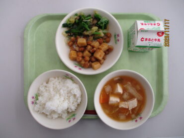 2025.11.17 1学年 2学年 3学年 全校生 11月17日の給食を紹介します 今日の給食は、牛乳、ごはん、ミックスみそ豆、小松菜と生椎茸のひたし、豚キムチ汁です。 小松菜 きゃべつ 生椎茸 地場産の野菜がたくさん届きました。和え物に使用した小松菜・きゃべつ・生椎茸は全て高岡市産、汁物に使用した人参・しめじは富山県産、大根は魚津市産のものです。豚肉や焼き豆腐や味噌も、高岡市のお店で作られていますよ。