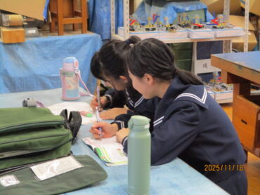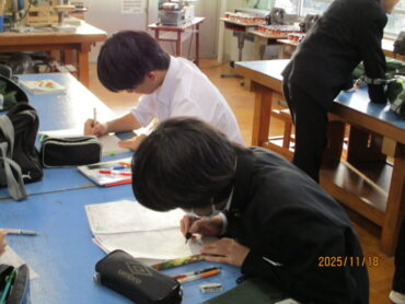 技術室の様子です。数学の提出物でしょうか、先生の点検を受けています。