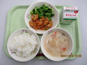 今日の給食は、高岡食19丼献立です。メニューは、牛乳、ごはん、国吉きのこのチキン南蛮丼、茹でブロッコリー、豆乳汁です。