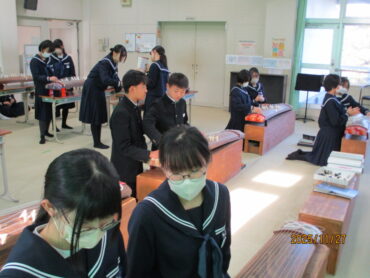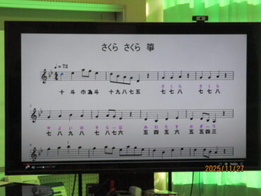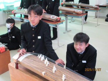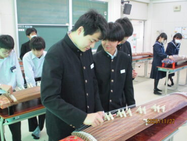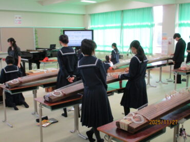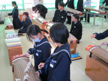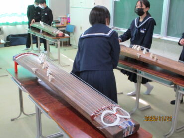 多目的室での2年3組の音楽の授業です。多数の筝が既にセットされており、生徒たちが「さくらさくら」を弾いています。