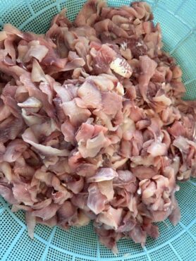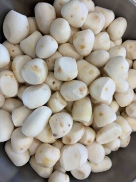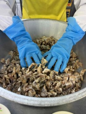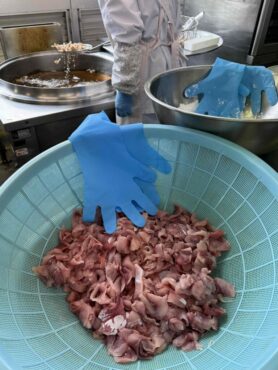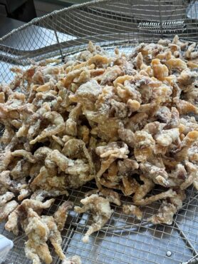 福岡町の特産品である鯉の切身をカラッと揚げた「鯉チップス」。この鯉は成田養魚園さんより届けられました。福岡町は明治から大正にかけて農家の半数以上が副業として食用の鯉を養殖していたため、鯉の産地として知られるようになりました。その後、第二次世界大戦中に鯉を養殖していた池を水田に変える政策が行われ、鯉の養殖は減少しましたが、成田養魚園では現在でも鯉の養殖が続けられています。伝統の手法と良質な清水で育てられ、肉の締まりがよく脂肪も適度にのった味のよい鯉です。今日は片栗粉を付けて優しく揚げた鯉に、味付けは塩のみで仕上げました。