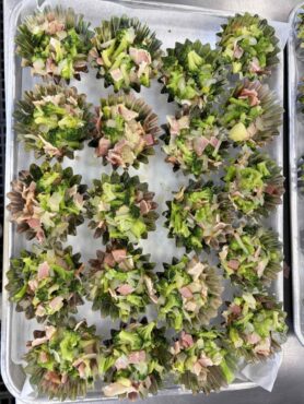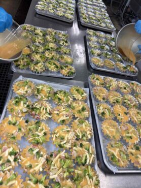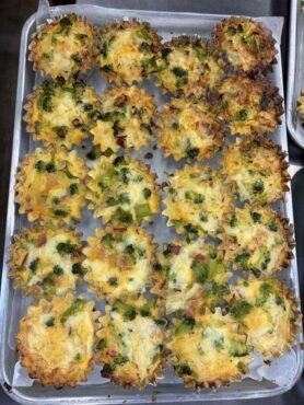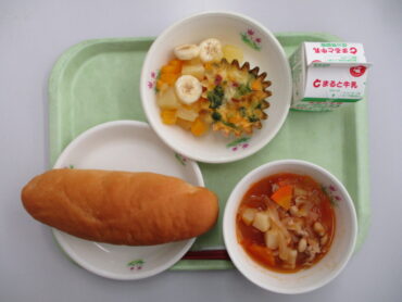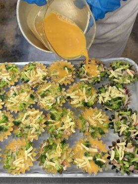 2025.11.28 NEW 1学年 2学年 3学年 全校生 11月28日の給食を紹介します 今日の給食は、牛乳、コッペパン、ブロッコリーとベーコンのキッシュ、フルーツ和え、ポークビーンズです。 ベーコン・ブロッコリー・玉ねぎを炒める 炒めた食材をカップに入れる 溶けるチーズをのせて卵液を注ぐ 20個ずつ焼いていく ブロッコリーとベーコンのキッシュ キッシュは、ベーコン・ブロッコリー・玉ねぎを炒めたら、溶けるチーズと一緒にカップに入れて、甘めの卵液を注ぎます。1つずつ丁寧に作ってくださいました。卵がふわふわで野菜たっぷり美味しかったです。