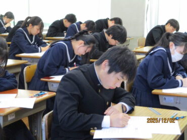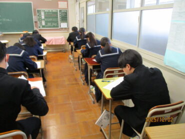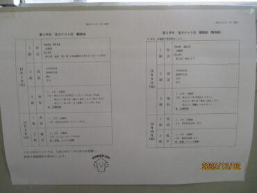 2025.12.2 NEW 3学年 3年生 実力テストが 今終わりました! 3年生は、昨日から実力テストを受けています。本日、12月2日(火)の2時間目の数学をもって、終了しました。ほっとしたことでしょう・・ 3年生のフロアには、受験に向けての参考資料があふれています。 3年生は、今回から4回の実力テストを行い、志望校を決めます。 体調管理を万全にゆったりとした気持ちで、誰もが通るこの時期を乗り切ってください。