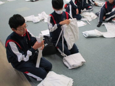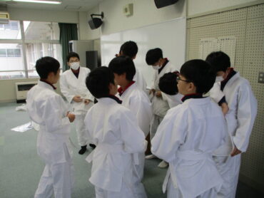 どの学級にも柔道部はいます。3組にも数名が・・先生と一緒になって正しい柔道着の着方を級友に伝授していました。