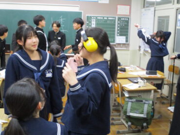 耳にヘッドホンをつけて耳を聞こえにく状態を体験しています。