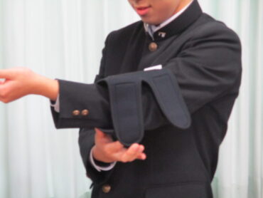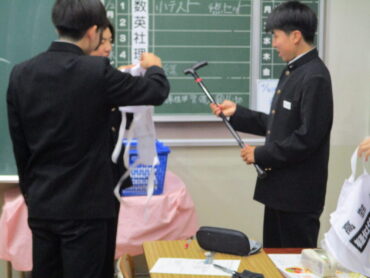 3年生の家庭科は、「家庭生活と地域の関わり「地域に暮らす高齢者との関わり」」を学習しています。今日の3年1組の家庭科では、疑似体験を通して、身体的特徴(高齢者)の理解を深めました。