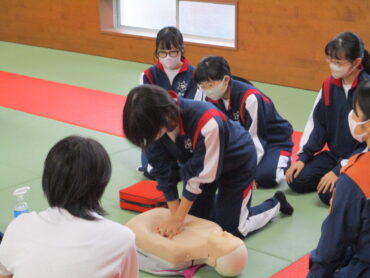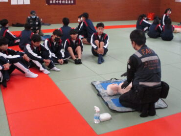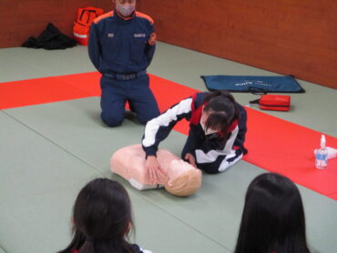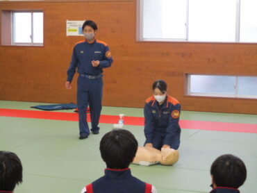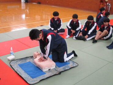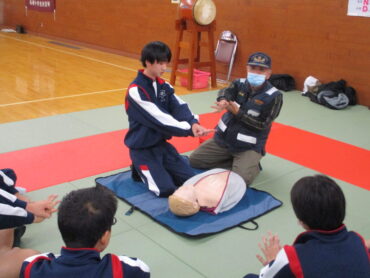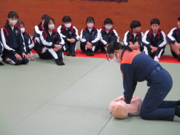 12月5日(金)1限目から3限目に、2年生全員で救命救急講習を行っています。1限目は、2年1組でした。この講習会は、保健体育の授業の一環です。高岡市消防団の方々を講師にお招きしています。