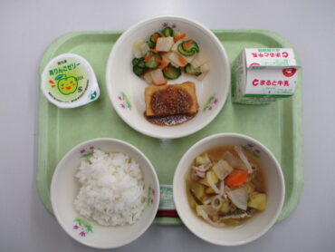 今日の給食は、ごはん 、牛乳、 揚げ出し豆腐のごまだれがけ、 色とり 、 豚汁、青りんごゼリーです。