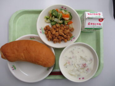2025.12.12 1学年 2学年 3学年 全校生 12月12日の給食を紹介します 地場産品献立 今日の給食は、コッペパン、 牛乳、 きなこ豆 、ドレッシングサラダ、 大根ポタージュ でした。 きゃべつ・人参は高岡市産、大根は魚津市産です。