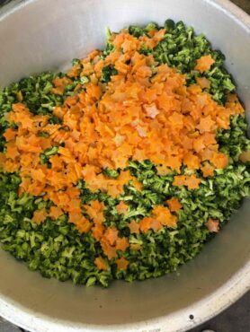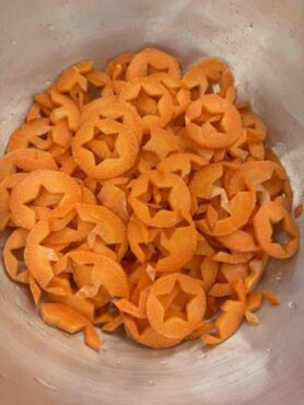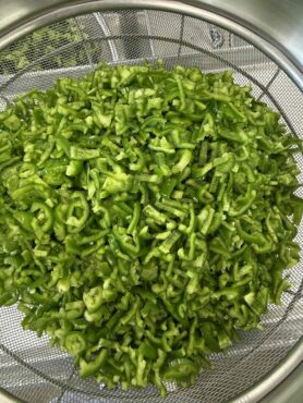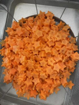 野菜サラダには星型の人参★が入っています。調理員と栄養士で、輪切りにした人参の1つ1つに型抜きをして星の形にしました。