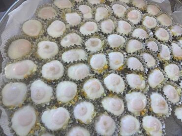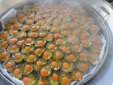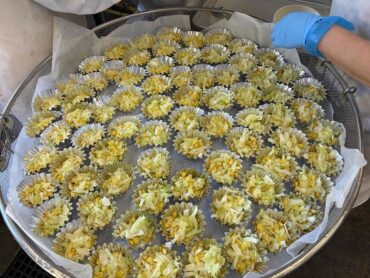 巣ごもり卵の作り方を紹介します。まず、千切りしたキャベツとコーンを炒め、カップの中に入れます。その上に割った卵を入れて、最後に塩コショウをのせたら蒸していきます。卵がしっかり蒸されたら完成です。福岡中の給食室では、大きな釜の中で蒸していますよ。