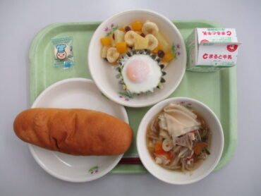 今日の給食は、牛乳、米粉入りパン、巣ごもり卵、フルーツ和え、ワンタンスープ、ピピピチーズです。