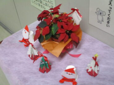 2025.12.22 全校生 クリスマスデコレーション、あさっては終業式 二学期もあとわずかになりました。保健室前には先生と生徒で作った素敵なクリスマスデコレーションが飾られています。 かわいいですね!中央にはポインセチアが