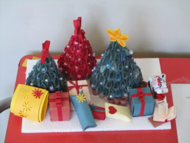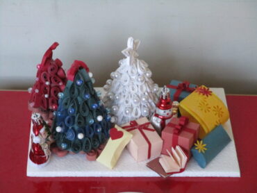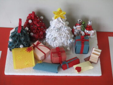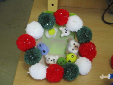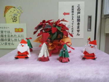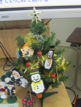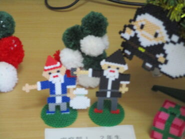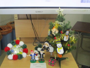 2025.12.23 1学年 2学年 3学年 全校生 クリスマスデコレーションⅡ 保健室前には、昨日紹介したポインセチアとサンタさんです これも、クリスマスバージョンでしょうか。 家庭部の共同作品です。 アイロンビーズのオーナメントと羊毛フェルトです。 1階階段前の大型モニターの前に展示されています。 3年生の各教室には、担任の先生が作ったデコレーションが保護者会を和ませてくれています。