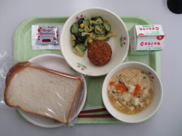 3学期最初の給食は、食パン、いちごジャム 、 牛乳、 高岡野菜のメンチカツ 、海藻サラダ、かきたまスープです。