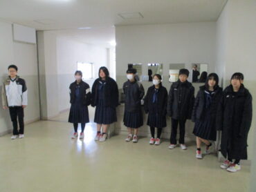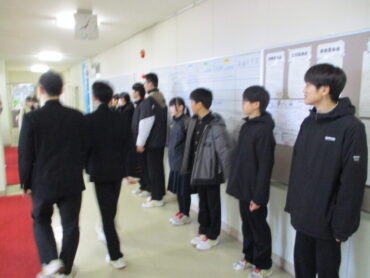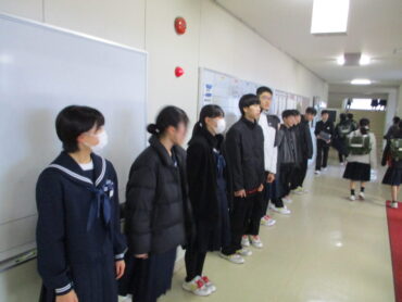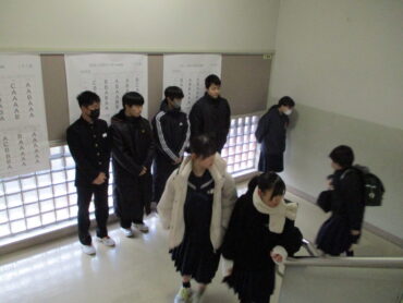 2026.1.14 2学年 全校生 生徒会執行部 笑顔リレー 3学期のスタートは、2年2組です! 生徒会執行部では、クラスや学年を超えて、温かい雰囲気を学校全体に広めることを目的に、12月16日(火) ~1月21日(水)の期間「笑顔リレー」を実施しています。朝の時間に各場所であいさつを行い、笑顔の輪を広げます。三学期のスタートは2年2組でした。 みんなより少し早く来て並びます。生徒玄関前、今日は、2年2組の出番の日でした。 1階階段踊り場 2階 2階踊り場