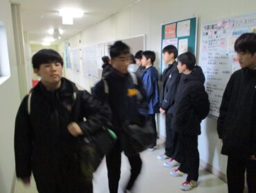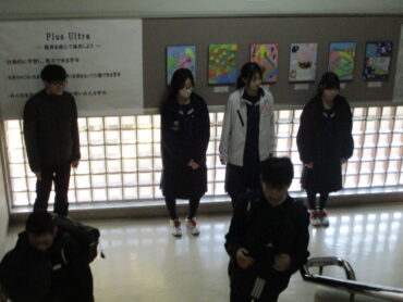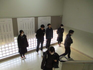 2026.1.15 2学年 全校生 生徒会執行部 笑顔リレー 今日は、2年3組です! 生徒会執行部では、クラスや学年を超えて、温かい雰囲気を学校全体に広めることを目的に、12月16日(火) ~1月21日(水)の期間「笑顔リレー」を実施しています。朝の時間に各場所であいさつを行い、笑顔の輪を広げます。 みんなより少し早く来て並びます。生徒玄関前、今日は、2年3組の出番の日でした。 1階階段踊り場 2階 2階踊り場