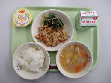 今日の給食は、高岡食19丼献立です。献立は、ごはん、牛乳、白菜たっぷり豚キムチ丼、ほうれん草のコーン和え、さつま汁、豆乳プリンです。