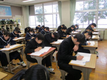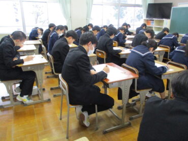 2026.1.20 3学年 3年生は最後の実力テスト 3年生は第6回実力テストを受検しています。入試と同じ社国理が本日、英数が明日となっています。 たくさん受けた、実力テストは、今回が最終になります。自信がもてる結果を出せたでしょうか。