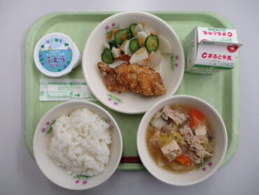 1月27日の給食は、ごはん 、牛乳、 しいらの米粉揚げ 、海洋深層水ゼリー 、かぶの柚子サラダ