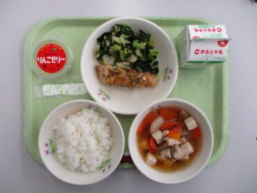 1月27日の給食は、ごはん 、牛乳、福来魚の高岡産ねぎみそがけ 、 青菜と生椎茸のひたし 、 高岡野菜のけんちん汁、国吉りんごゼリーです。