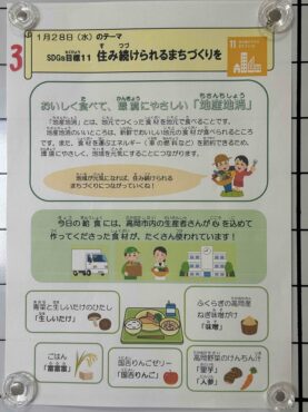 給食週間献立3日目のテーマは、SDGsの目標11「住み続けられるまちづくりを」です。